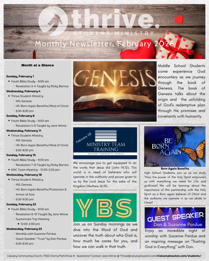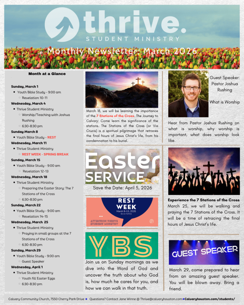 For more information on how to stay engaged with Thrive Student Ministry, please contact Jane Winne at Thrive@calvaryhouston.com.